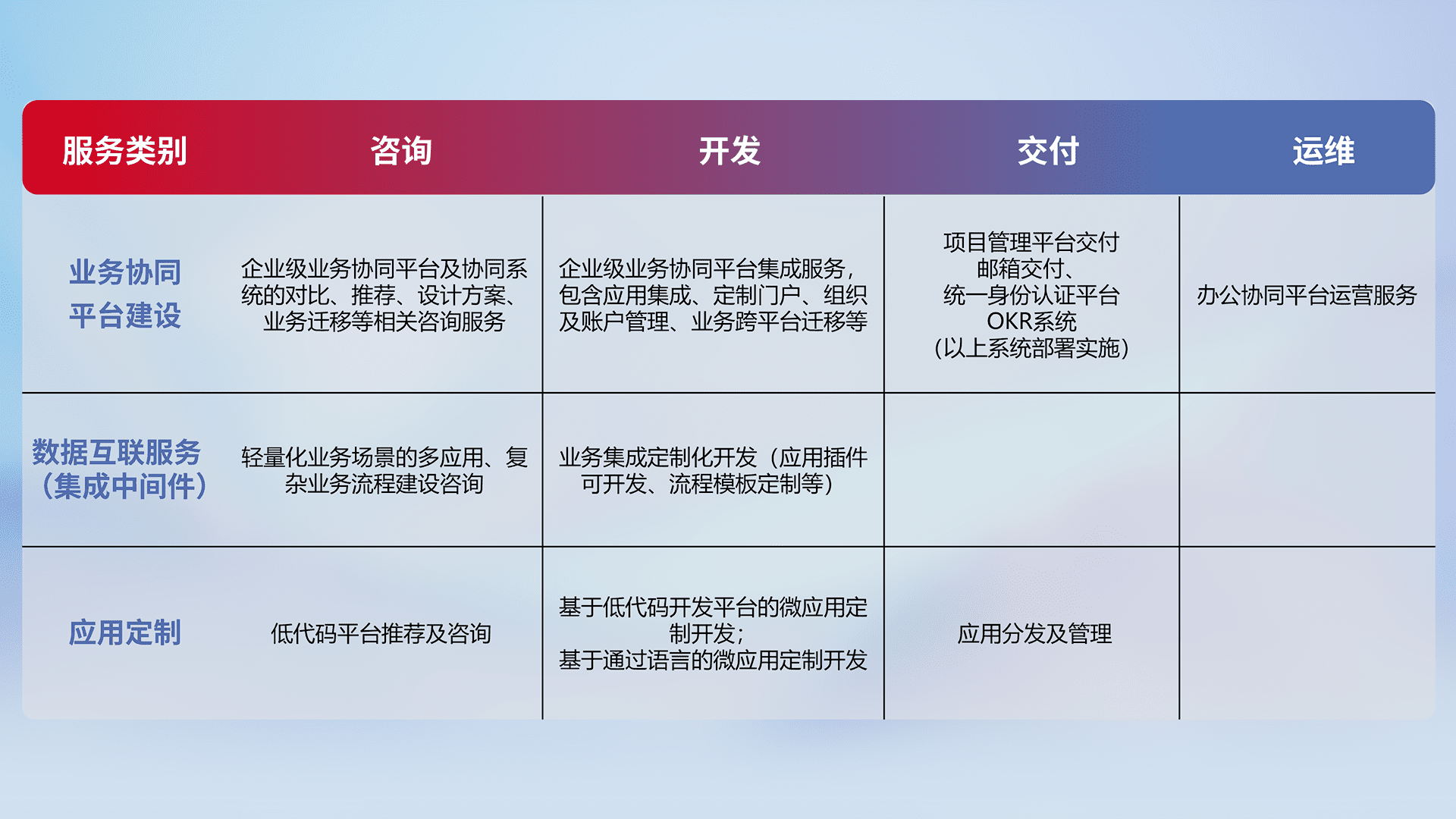 针对钉钉、、、、企微、、、、IDaas等平台级产品提供产品的规划、、方案、、交付、、定制化开发等服务,,,实现如统一协同办公、、智能客户服务、、混合会议管理、、、智能数据查询、、、等业务场景,,,,实现数字化转型。。。